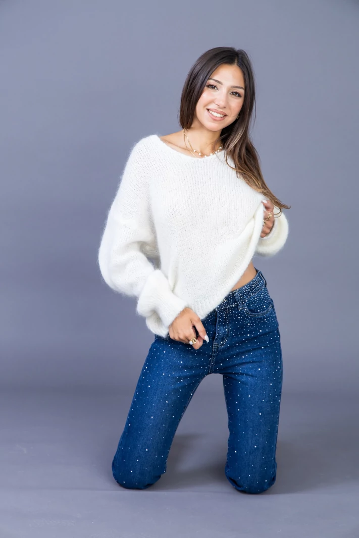 Taille haute, ligne droite nette et strass délicatement appliqués sur le devant : il allie sobriété et éclat, pour un look à la fois chic et audacieux.