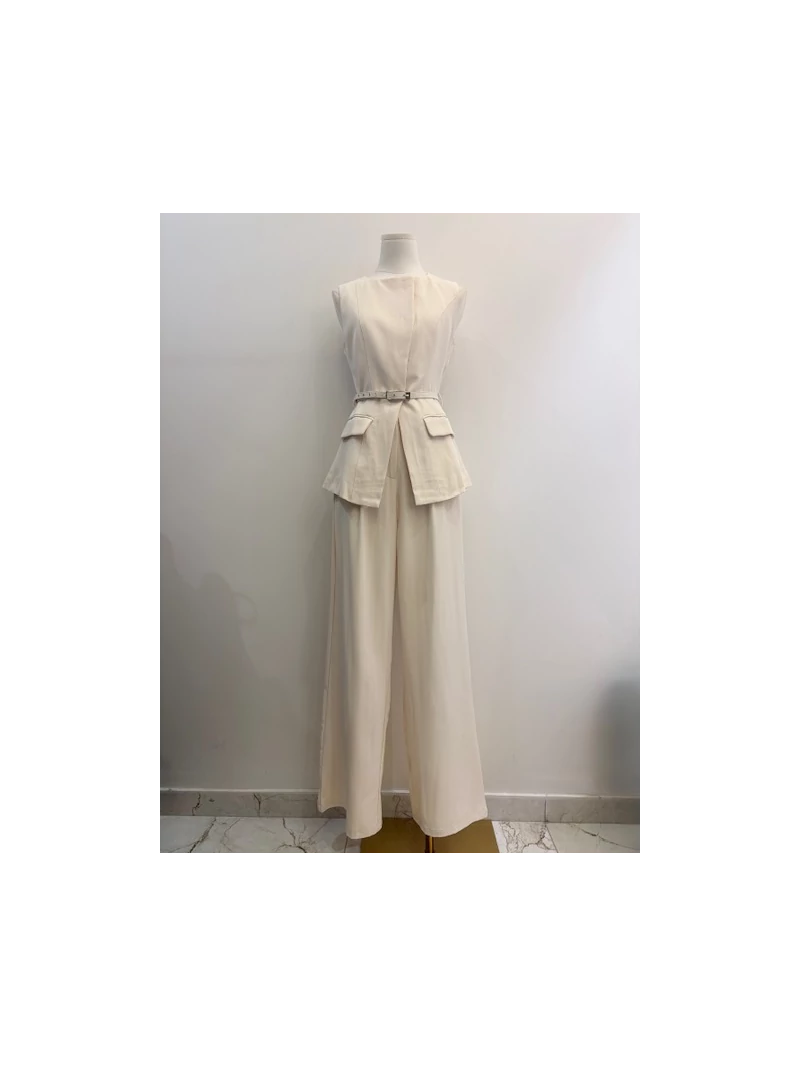 • Détails : Veste sans manches avec ceinture fine et poches décoratives, coupe légèrement évasée. Pantalon taille haute à jambe large, tombé fluide et confortable.