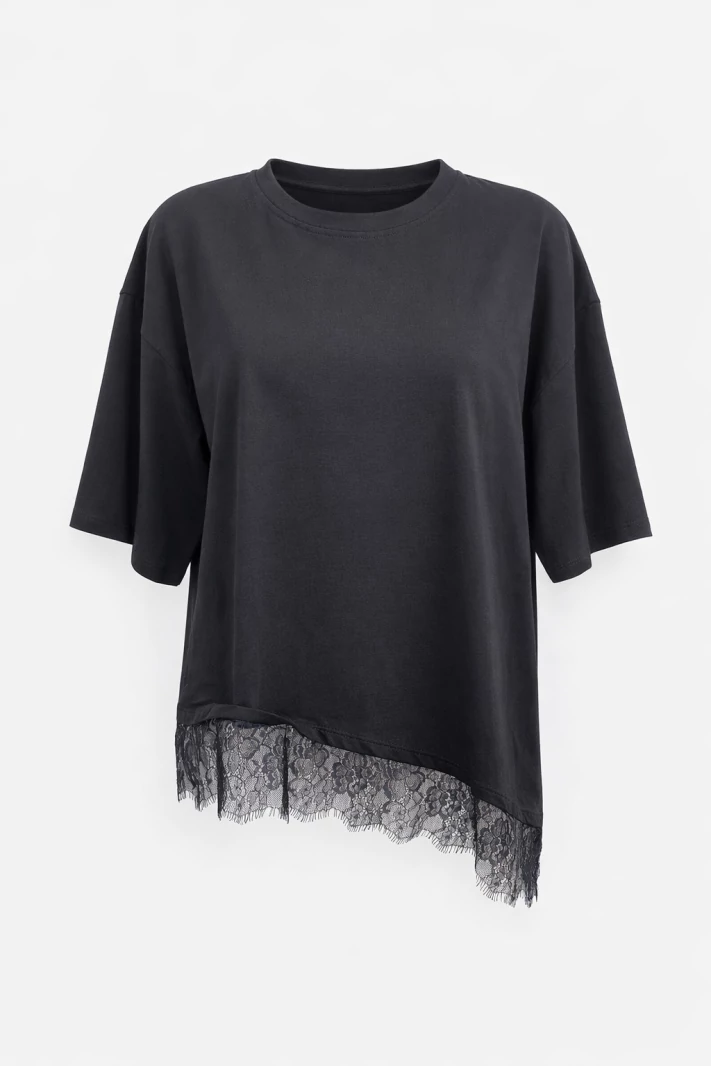 Ce top fluide à manches courtes séduit par sa coupe décontractée et féminine. Son côté asymétrique est délicatement souligné par une finition en dentelle qui apporte une touche élégante et raffinée. Facile à porter au quotidien, il se marie aussi bien avec un jean qu’un pantalon plus habillé pour un look chic et confortable.