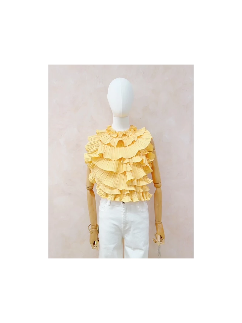 Top jaune à volants plissés avec dos nu délicat, pour une allure féminine et audacieuse.