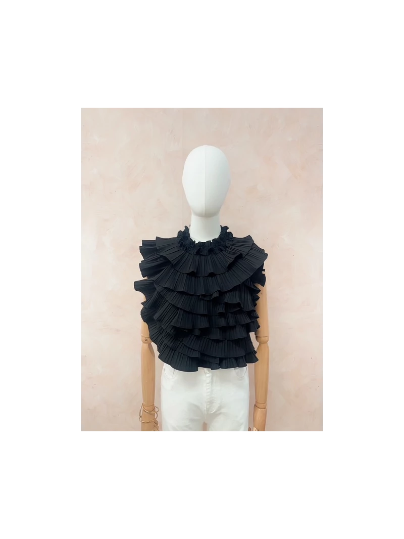 Top noir à volants plissés avec dos nu délicat, pour une allure féminine et audacieuse.